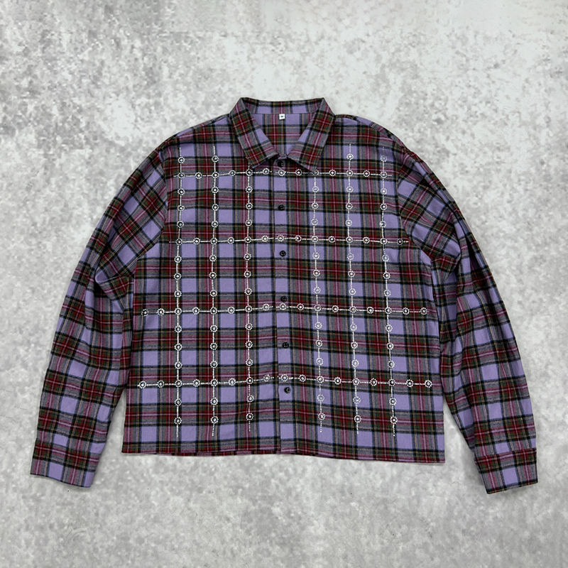 Custom Streetwear Oversized Men's Plaid Shirt Boxy Rhinestone Drop Shoulder Button Up Shirt Heavyweight Cotton Polo Shirts